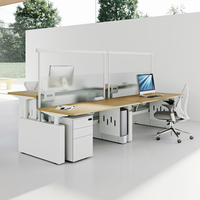 モダンな電動昇降式ダブルワークステーション、プライバシースクリーン付き、デスク下スライド式キャビネット、環境に優しい木製、家庭用・業務用